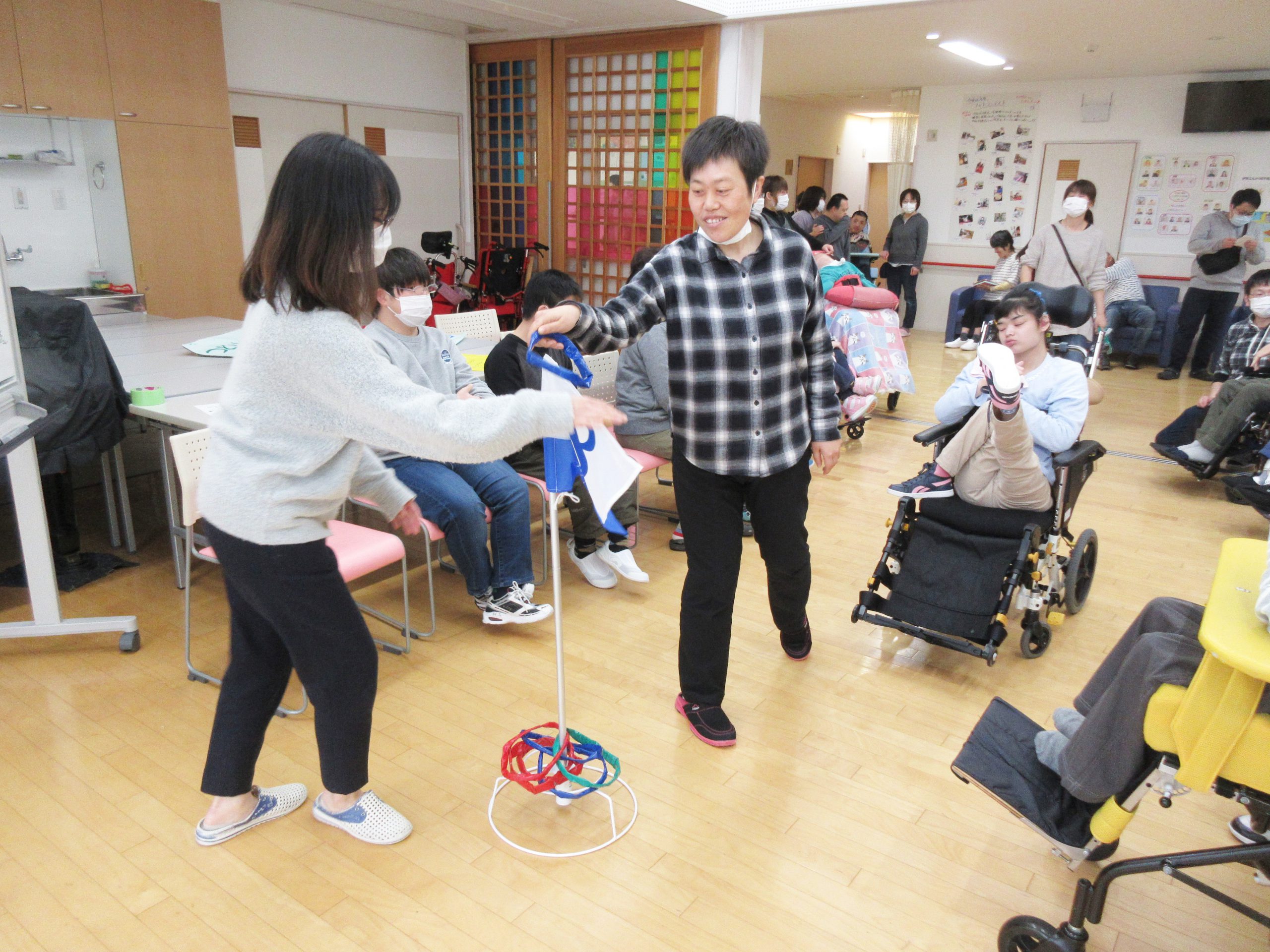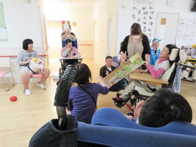 コロナウイルス感染症の影響で外出を自粛している仙台つどいの家の面々ですが、『こんな時だからこそ』を合言葉に室内活動の充実に取組んでいます。その一つが『合同レクリエーション』。室内活動の定番ですが、全グループ合同でレクを楽しみます。こんな状況になってから、職員を3チームに分けて、それぞれのチームで企画運営する合同レクリエーションを行っています。あるチームは『つどリンピック2020』、あるチームは『借り物競争』、そしてあるチームは『手作りボッチャ大会』などなど・・・。各チーム、趣向を凝らして企画します。